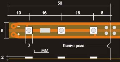Ленты поставляются с возможностью резки через 3 диода (5см), линия отреза отмечена.