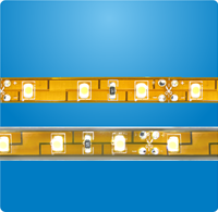 Гибкие светодиодные ленты представляют собой последовательность светодиодов, смонтированных на гибкой монтажной плате на расстоянии 16-17 мм друг от друга. На основание платы нанесен универсальный монтажный скотч 3М.
